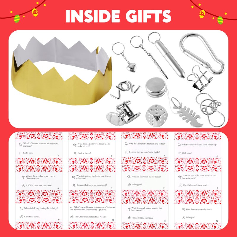 - Xmas No-Snap Party Favor: Our Holiday Party Favor Set includes 12 packs of Christmas party table favors with 4 kraft snowflake designs. Each party favor contains a paper crown hat, a Christmas joke paper, and a random gift inside.