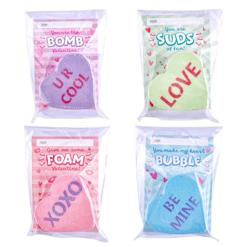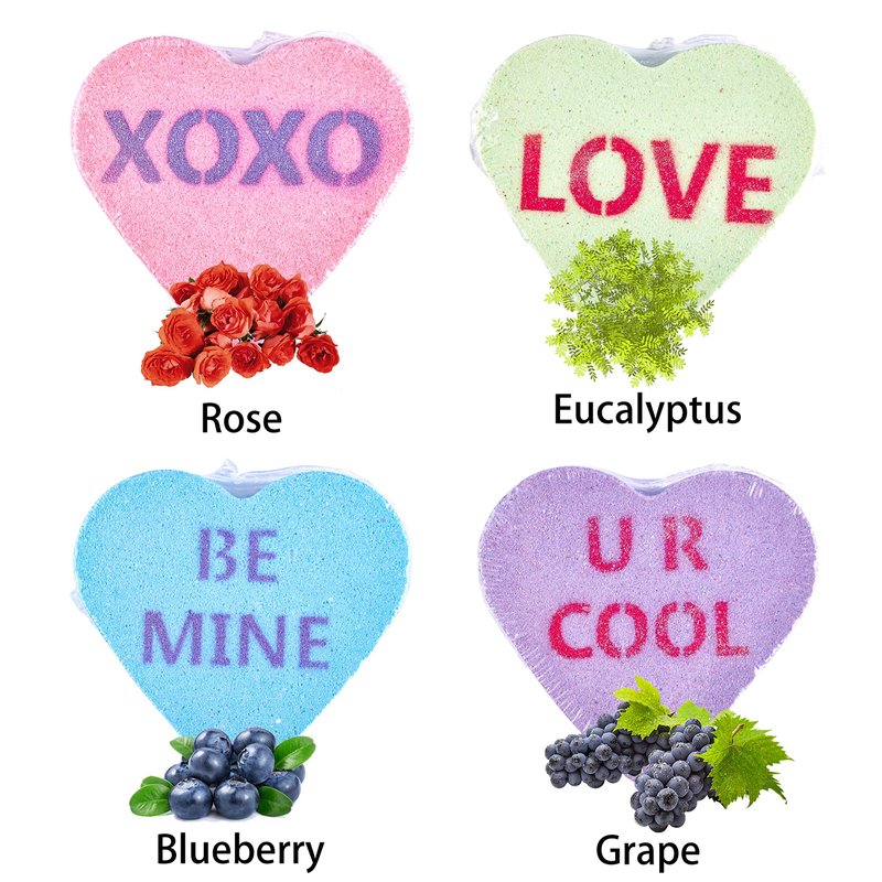 - RELAXING FRAGRANCE. There are 12 heart-shaped bath bombs in 4 styles including Red XOXO (Rose), Green LOVE (Eucalyptus), Blue BE MINE (Blueberry), Purple U R Cool (Grape). Heart-shaped Bath Bombs measuring 56g, Cards 3.9 x 2.8 inches. Kids will enjoy playing with our Bath Bombs with Cute Valentines Card! Ideal Valentine gifts for boys and girls.