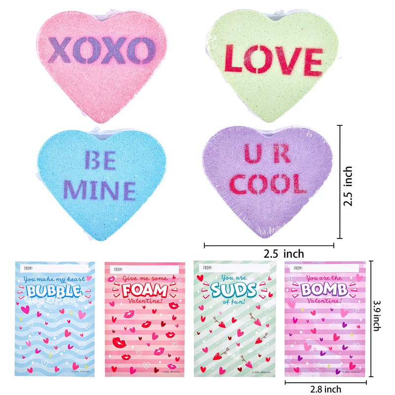 RELAXING FRAGRANCE. There are 12 heart-shaped bath bombs in 4 styles including Red XOXO (Rose), Green LOVE (Eucalyptus), Blue BE MINE (Blueberry), Purple U R Cool (Grape). Heart-shaped Bath Bombs measuring 56g, Cards 3.9 x 2.8 inches. Kids will enjoy playing with our Bath Bombs with Cute Valentines Card! Ideal Valentine gifts for boys and girls.