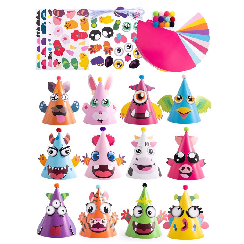 - SUPER VALUE PACK. Our All in One Party Hats Creativity Set includes 12 packs of hat corns with stickers to make into 12 different designs of cute animal hats, each hat is about 5” x 5” x 7”. Perfect for Kids and Adults.
