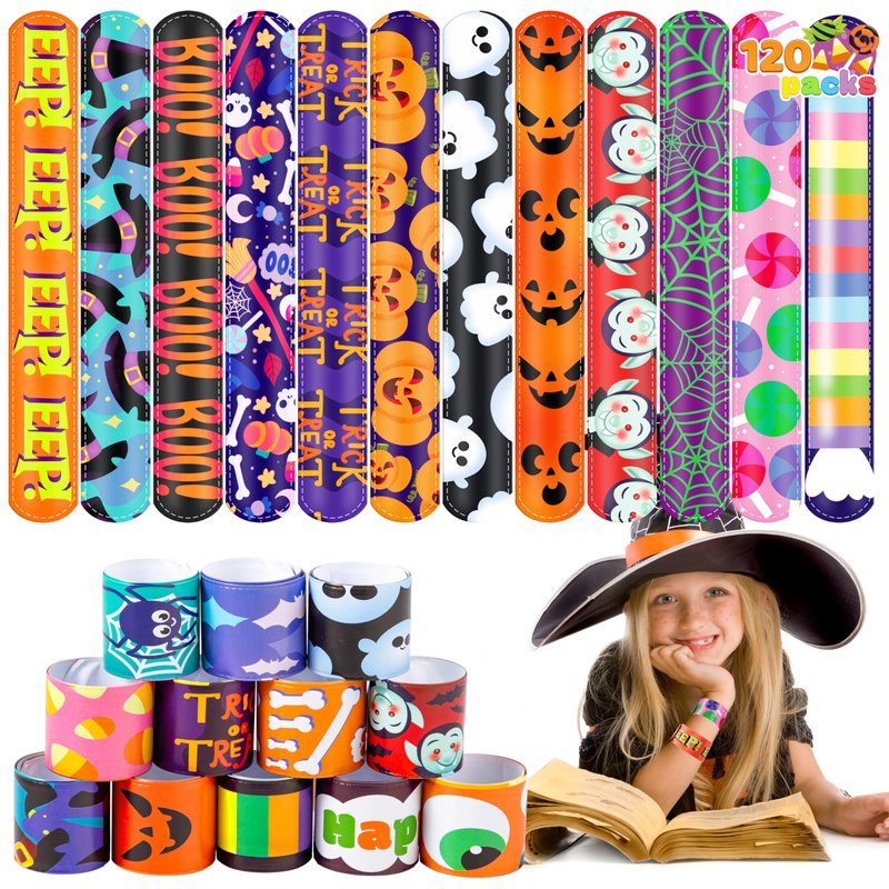 - SUPER VALUE PACK. Our Halloween treats includes 120 pieces of Halloween slap bracelets with 24 designs which are the perfect non-candy presents for Halloween