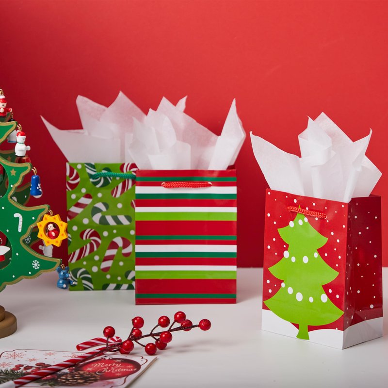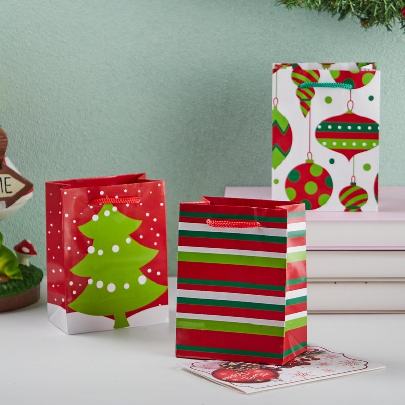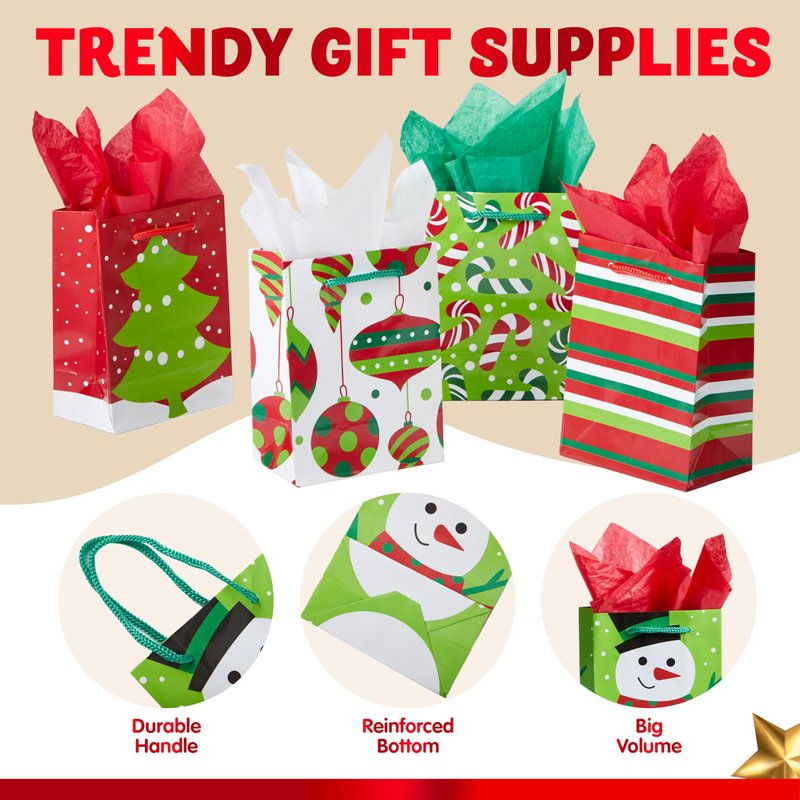 - SUPER VALUE PACK. Our Xmas Gift Bags include 18 pieces of Paper Gift Bags with 6 designs, measuring 4.3" wide x 5.5" tall x 2.5".(not included tissue paper)