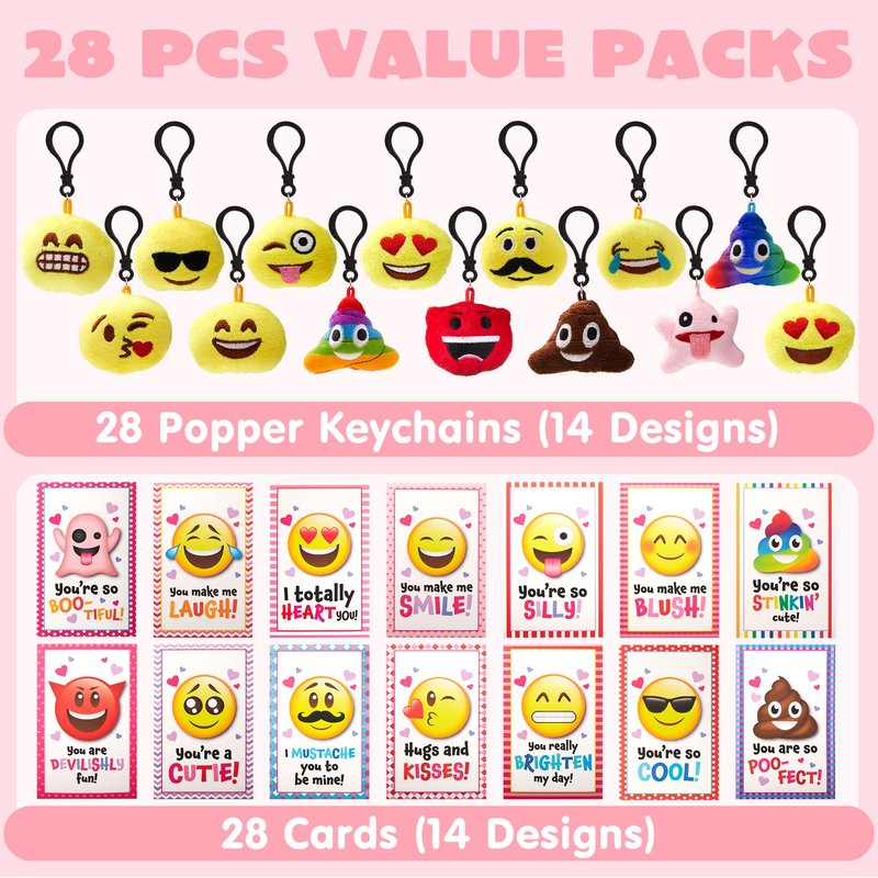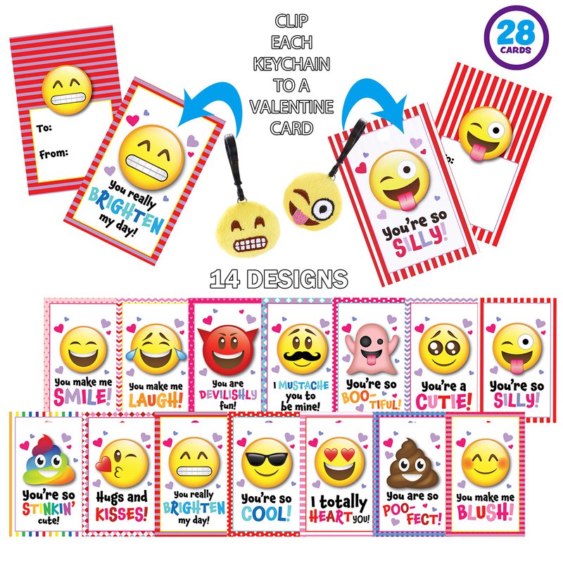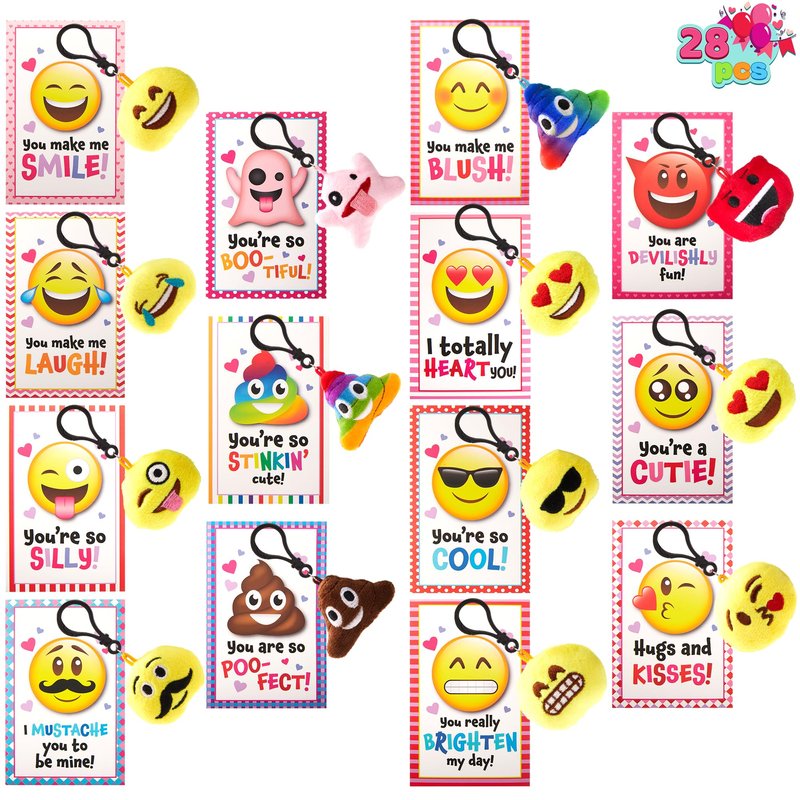 JOYIN 28 Pack Valentines Day Gifts Cards with Expression Face Plush Key-chain, Greeting Cards with Plush for Valentine Classroom Exchange, Kids Party Favor, Game Prizes and School Rewards