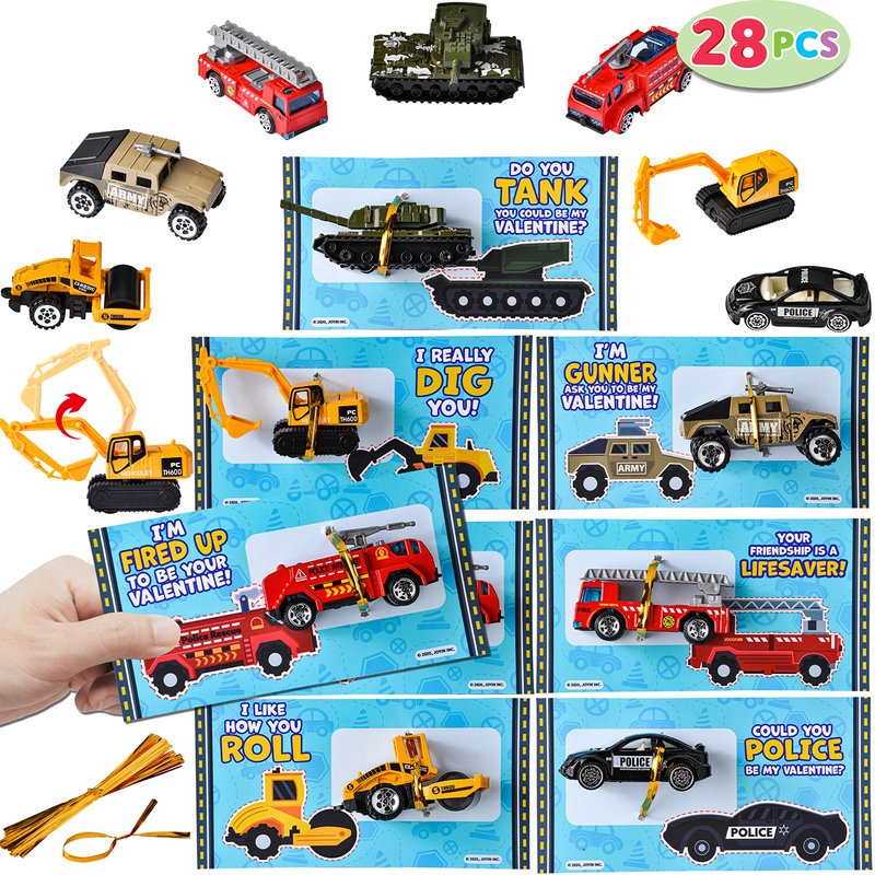 JOYIN 28 Packs Valentines Day Cards with DieCast City Vehicles Toys for Valentine Party Favor, Classroom Exchange Prize, Valentine’s Greeting Cards, Die-Cast Vehicle Toys