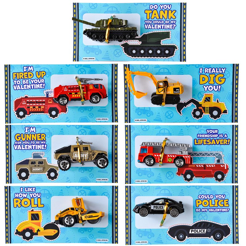 - UNIQUE DESIGN. There are 7 different designs of City Vehicle included. There are also 7 designs of Valentine’s Gift cards. Each gift card has a unique punchline with a Valentine pun matching the attached gift toys’ theme.
