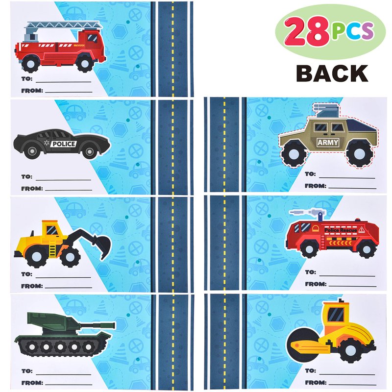 JOYIN 28 Packs Valentines Day Cards with DieCast City Vehicles Toys for Kids Valentine Party Favor, Classroom Exchange Prize and Gifts for Boys, Valentine’s Greeting Cards