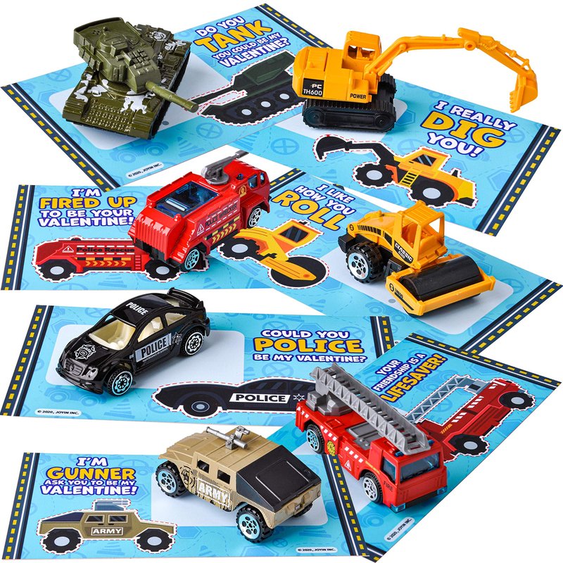 SUPER VALUE. Our Die-Cast City Vehicles Toys Valentines Day Party Favor Set includes 28 Diecast City Vehicles, gift cards, and foil ties.