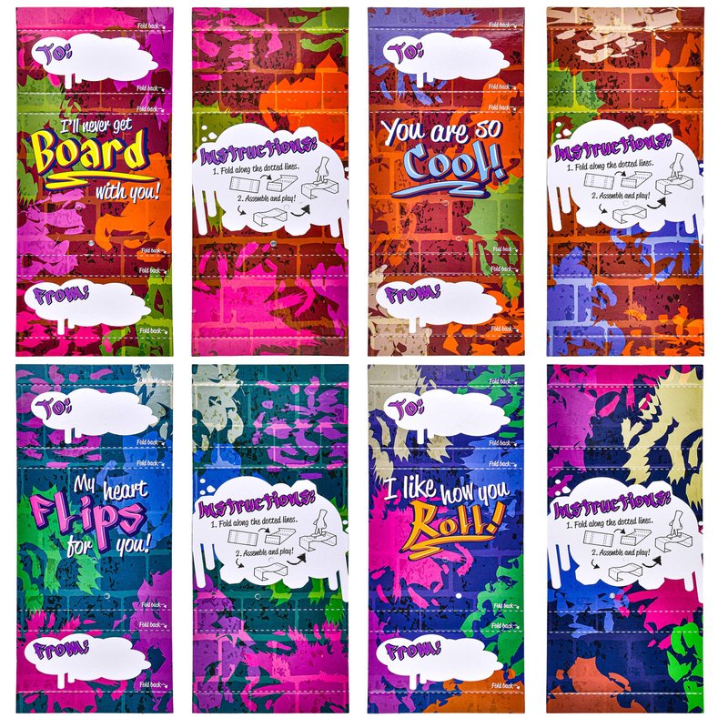 - UNIQUE DESIGN. There are 4 card designs and 4 finger skateboard designs with attractive decorations, and a special punchline matching a Toys’ theme. Kids will enjoy our Finger Skateboards with Cute Valentines Card! Ideal Valentine notes for boys and girls.