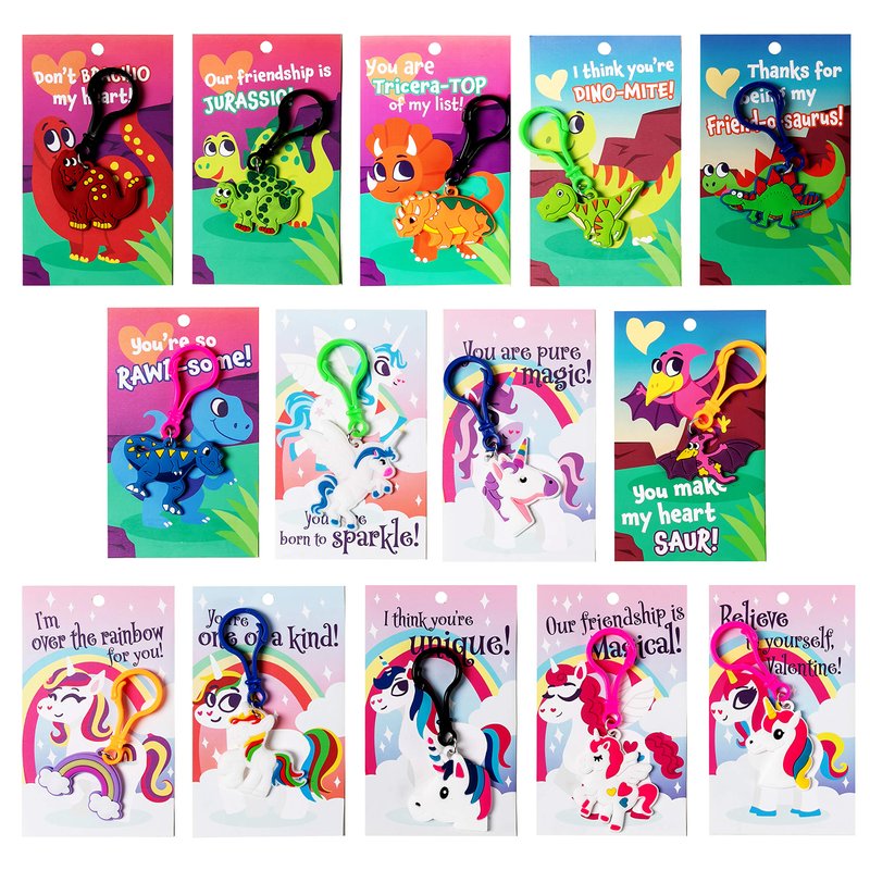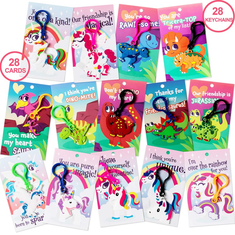 - UNIQUE DESIGN. Comes with 4 variations of Adorable Keychains, 14 Dinosaurand 14 Unicorns, as well as 14 types of Cards that match the keychain. Kids will enjoy playing and giving out these cute little keychains, perfect for Valentine’s. Ideal Valentine notes for boys and girls.