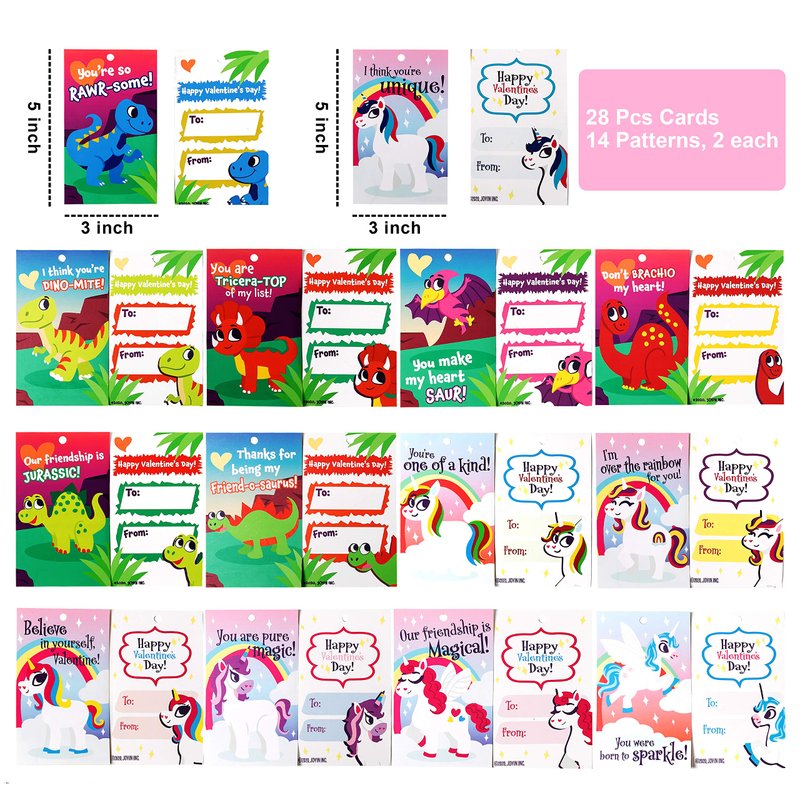- SUPER VALUE PACK. Our Valentine Keychain Set includes 28 valentine’s cards with cute, humorous messages that uniquely match along with the 28 pieces keychains, 14 Dinosaurs, and 14 Unicorns. The pendant measures 1.77-2.36 x 1.6 inches, Cards 3 x 5 inches.