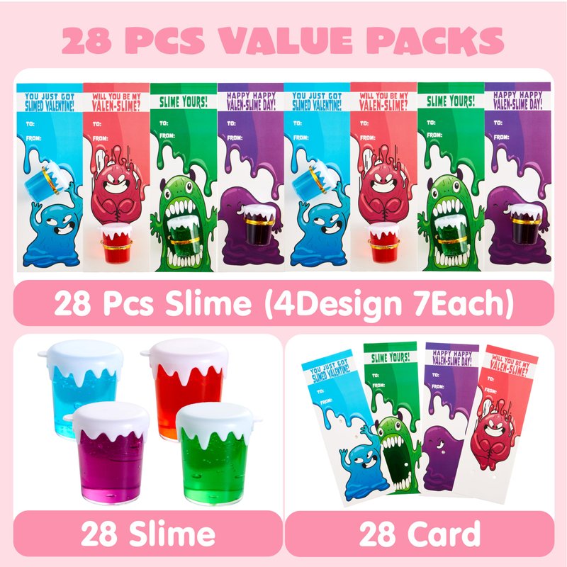 - SUPER VALUE COMPREHENSIVE SET. Our Valentine Mystery Slime Kit includes 28 Valentine cards with 4 designs, 28 slimes in 4 colors blue, green, pink and purple and 28 twist ties.