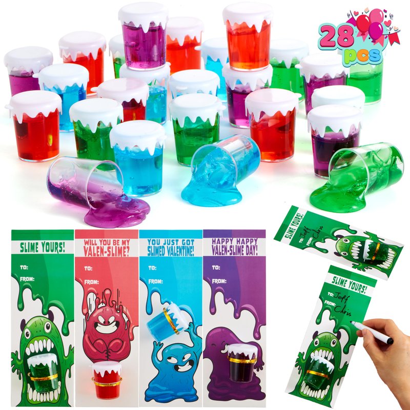 JOYIN 28 PCS Valentines Cards with Slime Party Favor Toys for Classroom Exchange Cards and Valentines Party Favor
