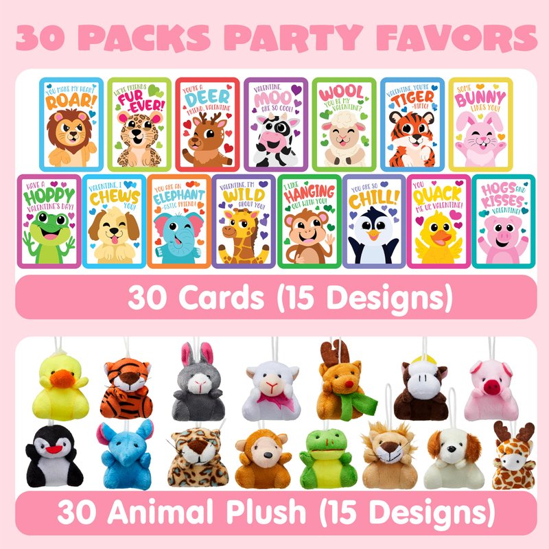 - FESTIVAL GIFT SET: Featuring 30 packs of toy, each featuring 15 plush toy designs and 15 unique card designs. The Animal plush measures 3 inches tall while the valentine cards measure 4 x 6 inches. The best balance of quantity and variety for extended play.