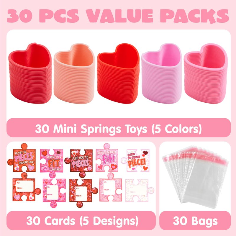 - DELUXE GIFT SUIT: Elevate celebrations with our 30-pack Mini Springs in heart shape for charming, Each toy comes with one of 5 charming card designs, dynamic toys that encourage imaginative play, fostering creativity in young minds beyond the Valentine's Day celebrations.