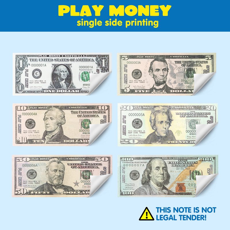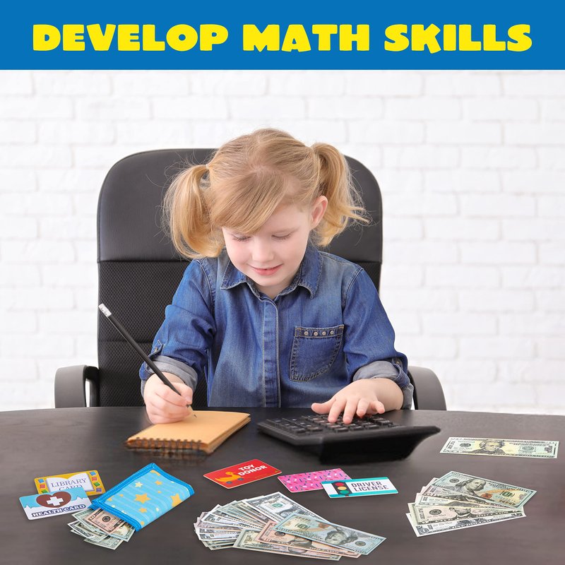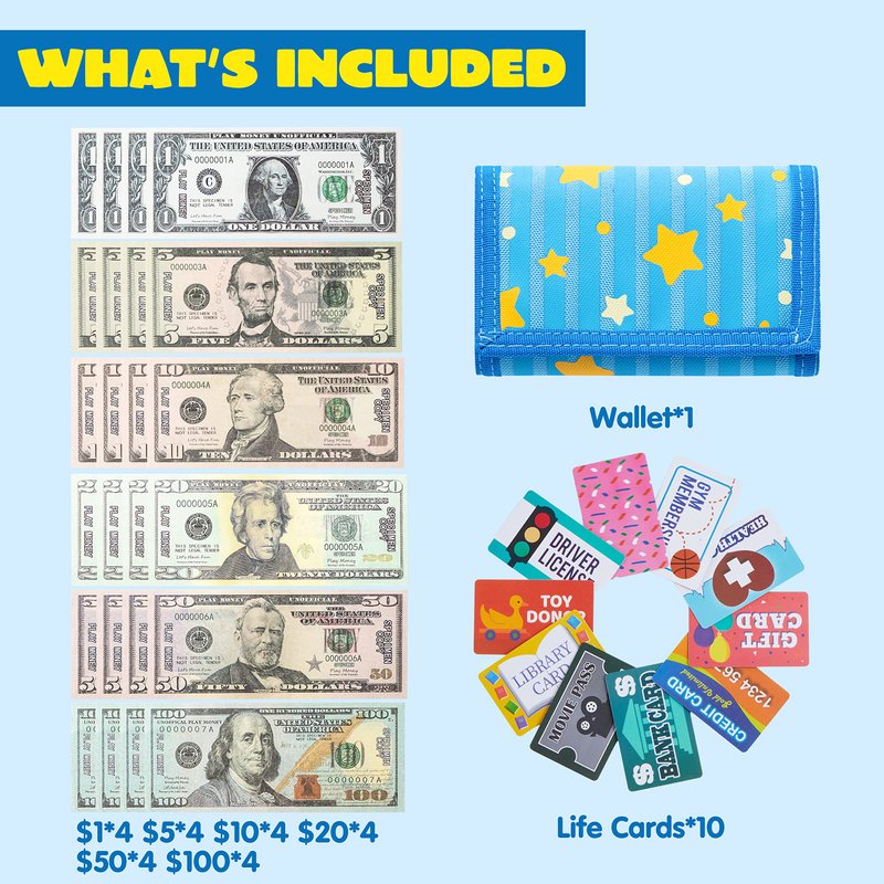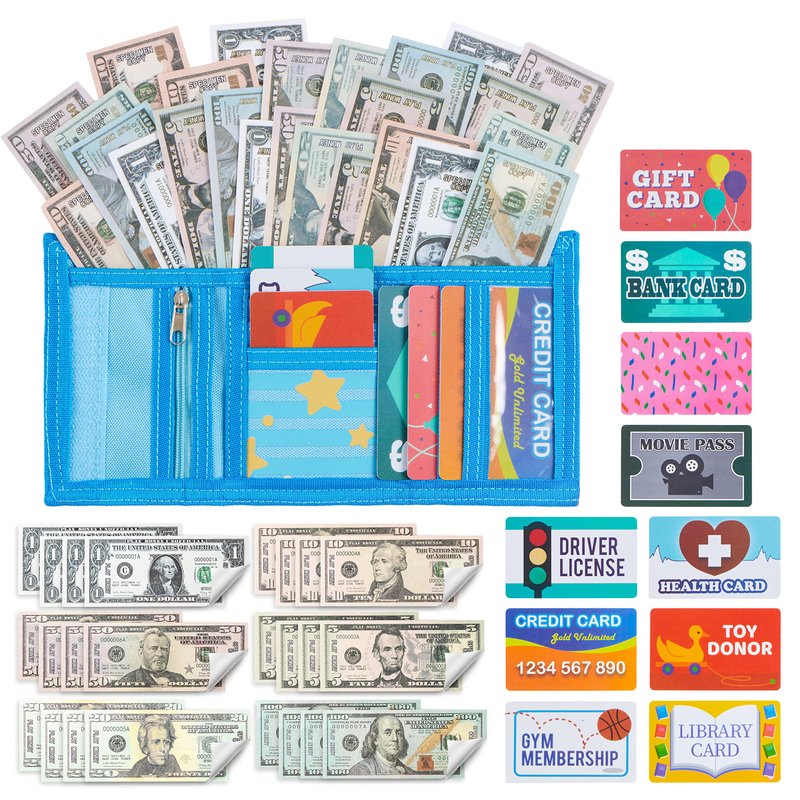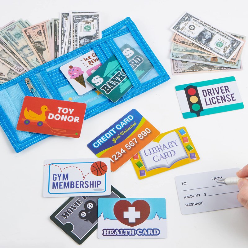 - PRETEND TO SHOP: Teach your little one the value of money and how we use it with our Pretend Wallet with Play Money and Cards. WHAT’S INCLUDED: 1 FOLDING WALLET, 24 PLAY MONEY BILLS(COPY), 10 PRETEND CARDS, INCLUDING BANK CARD, CREDIT CARD, DRIVERS LISCENSE, GYM MEMBERSHIP AND MORE!