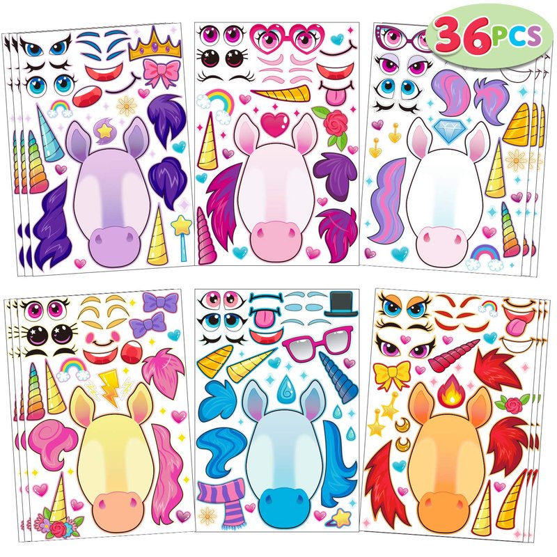 Our 36 pieces are unicorn theme party supplies to mix and match decoration stickers. Pack includes 6 different themed unicorns with multiple colors Each sheet has 3 different designs of eyes, mouths, and even eyebrows to make whatever silly or cute faces your kids like. Enjoy creativity and fun to your party celebration for birthday and house party, group activity, art class or other activities. Re-usable! The 10 inches by 7.5 inches mix and match stickers are made of high-quality paper material. Item number: 11448