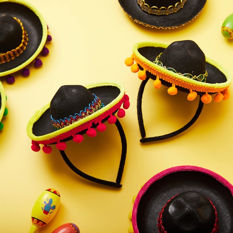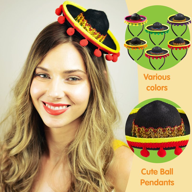 - SUPER VALUE PACK. Our festive headbands include 6 packs of fiesta fabric sombrero headbands, featuring black flexible headbands with colorful ball fringes and unique patterns on attached sombrero.