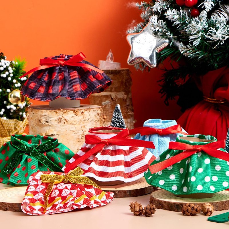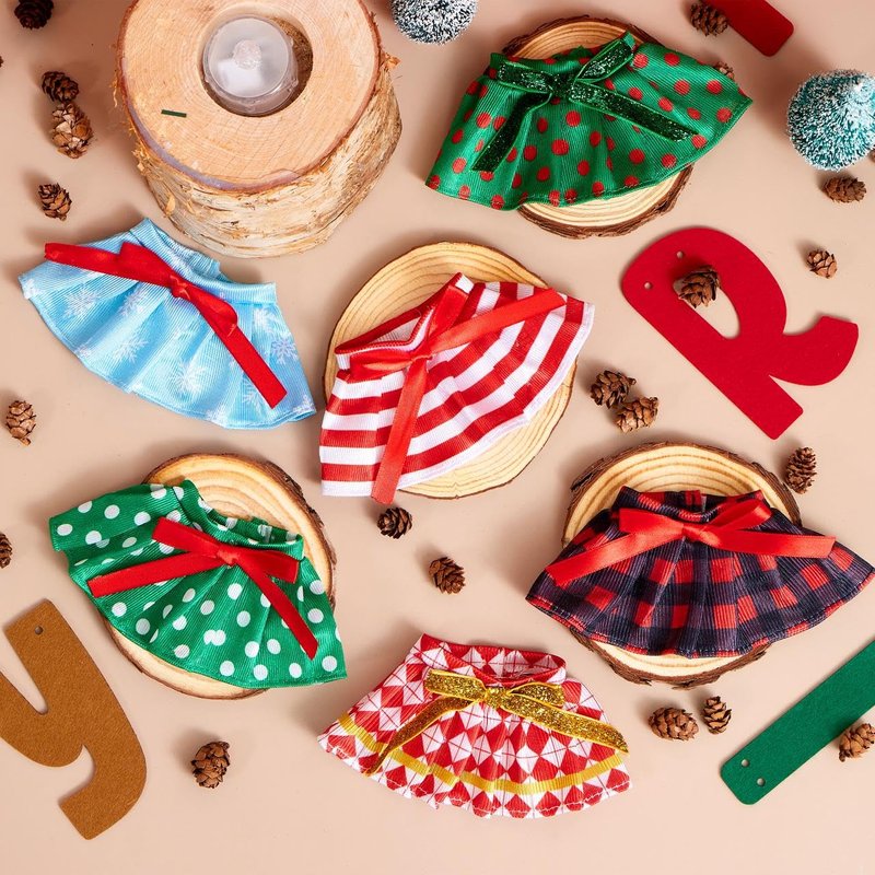 Unique Design. Design with Christmas elements, 6 different appearance designs. Classic Christmas colors, white polka dot pattern green doll skirt, red polka dot pattern green doll skirt, red and white checkered doll skirt, red and black checkered doll skirt, blue doll skirt match white snowflake pattern, red and white striped doll skirt. Adorned with charming Christmas designs and sweet bow details, these outfits add an extra dose of whimsy to your doll appearance.