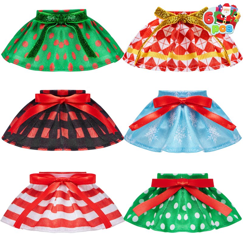 - Unique Design. Design with Christmas elements, 6 different appearance designs. Classic Christmas colors, white polka dot pattern green doll skirt, red polka dot pattern green doll skirt, red and white checkered doll skirt, red and black checkered doll skirt, blue doll skirt match white snowflake pattern, red and white striped doll skirt. Adorned with charming Christmas designs and sweet bow details, these outfits add an extra dose of whimsy to your doll appearance.
