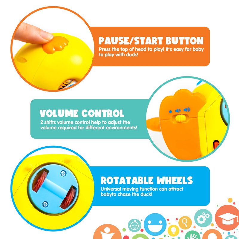 - Extremely Fun AND EDUCATIONAL TOY: Sensory Development – Big colorful buttons and lights encourage baby’s Touch and Exploration, Auditory Learning – Sounds and Songs develop baby’s Listening and Sense of Music and Rhythm. Motor Skills – Duck’s Waddling Movement with Lights attracts baby to Crawl and Chase while the duck’s shape and Boldly-colored buttons help to hone Finger Dexterity.