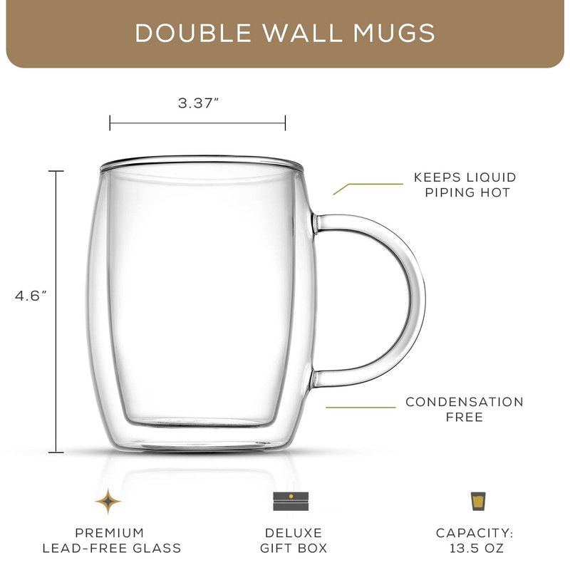 JoyJolt Double Wall Glass Coffee Mugs - 13.5oz Double Walled Glasses, Thermal Borosilicate Glass Insulated Coffee Mug. Clear Coffee Glass Cup, Cappuccino Mug, Iced Coffee Cup, Tea Mugs