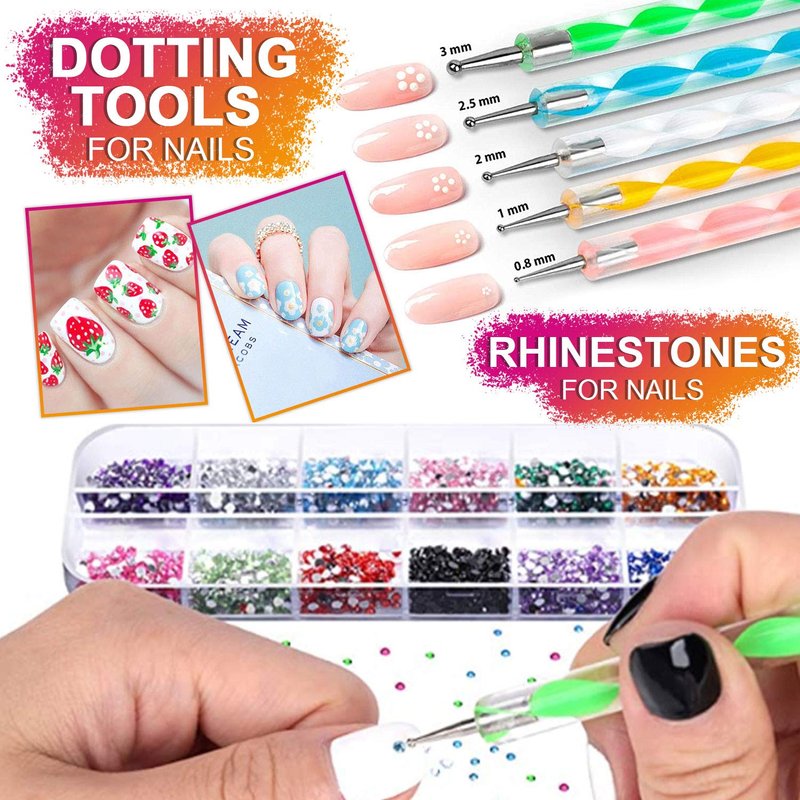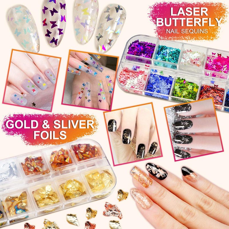 - 💖Nail Art Tool Starter Kit: Nail art design tools with everything including 15pcs nail art brushes, 5pcs nail art dotting pens, 3pcs 3d butterfly nail art stickers and 1sheet little daisy flower sticker, 3boxes nail art accessories with nail foils, nail art rhinestones and 3d holographic butterfly nail glitter and 10pcs assorted colors nail striping tapes.