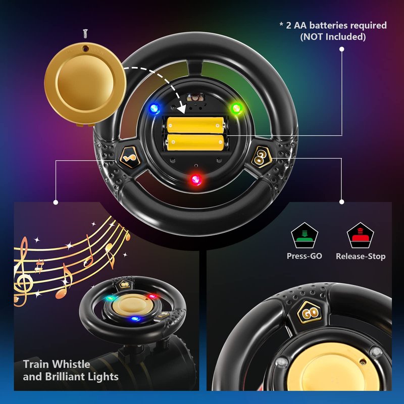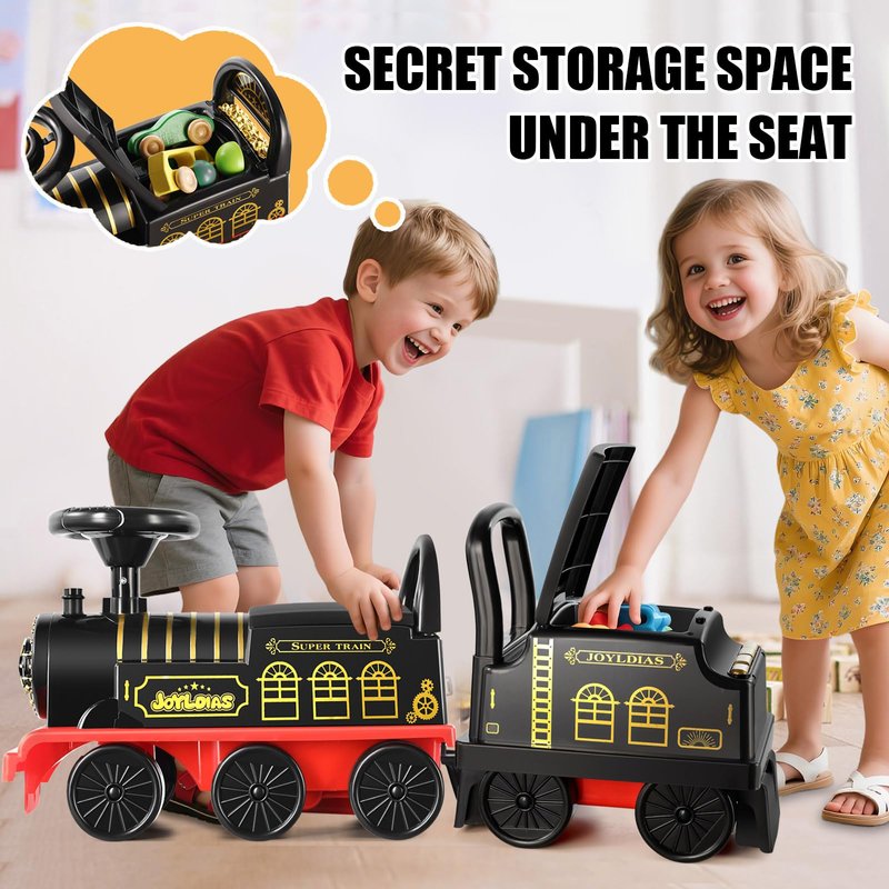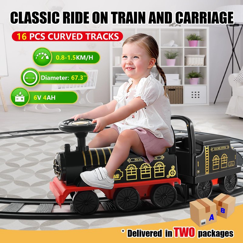 JOYLDIAS Ride On Train with 16pcs Curved Tracks and Carriage, 6V Electric Ride On Toy Train for Kids with Lights, Horns, Storage, Retractable Foot Pedals for Toddlers Under 39 inch, Black