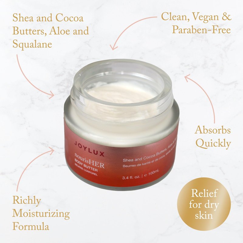 Joylux nourisHER Body Butter for Dry to Very Dry Skin with Shea Butter, Cocoa Butter, Aloe Vera & Squalane, Creamy, Clean Moisturizer for Intense Hydration 3.4 oz