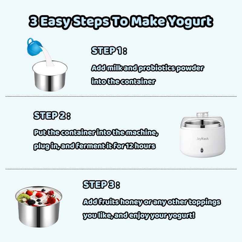 - [EASY TO USE]: Simply add whole milk and probiotics powder, plug in, and ferment it for 12 hours, then your yummy yogurt is done.