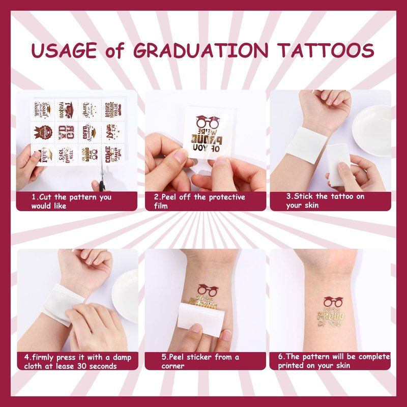 - Easy to Apply: These grads temporary tattoos are pretty quick and easy to apply. Firstly, cut the pattern you would like and peel off the protective film; secondly, stick the tattoo on your skin and firmly press it with a damp cloth at lease 30 seconds; at last, peel sticker from a corner and the pattern will be completely printed on your skin.