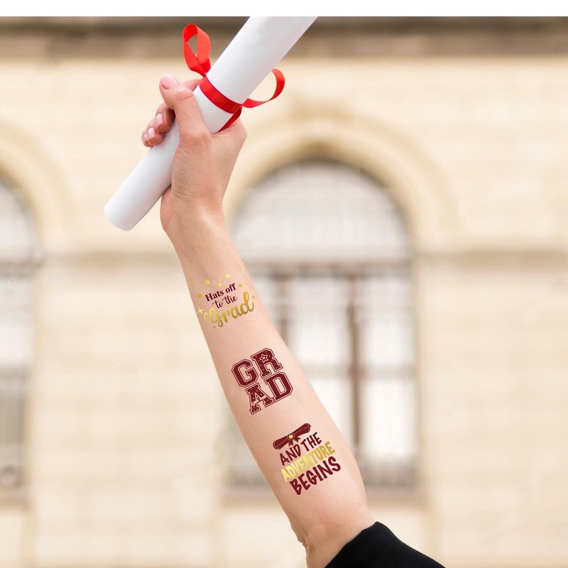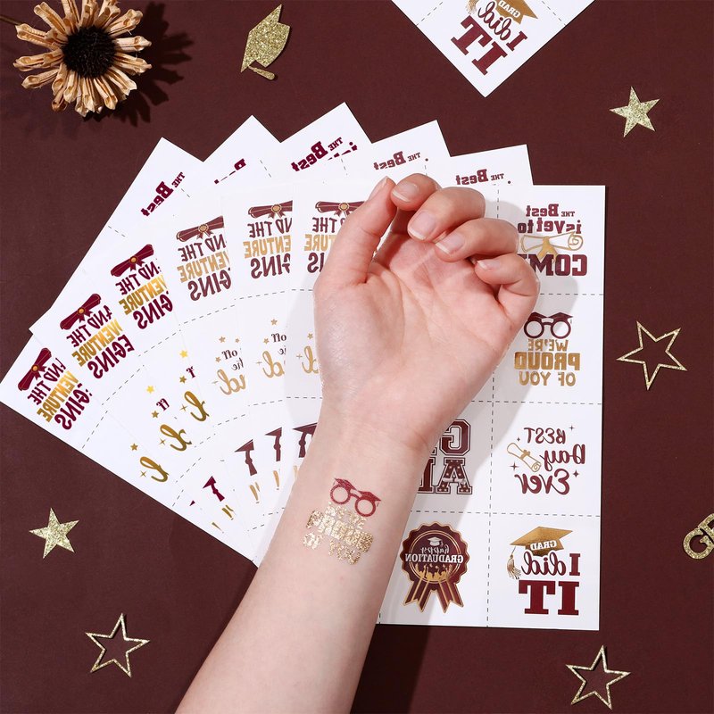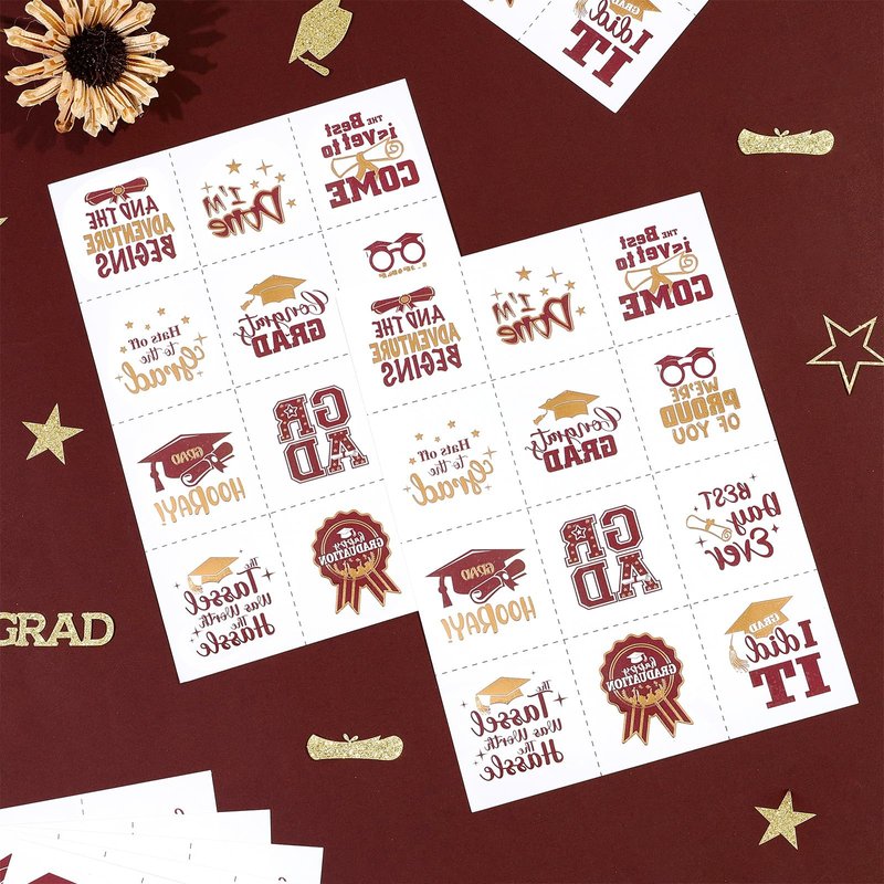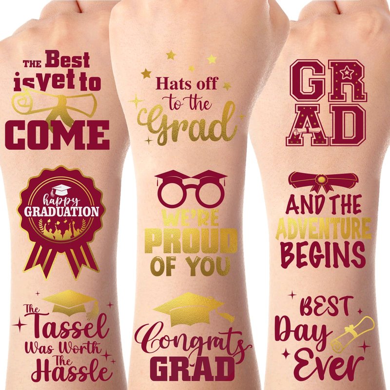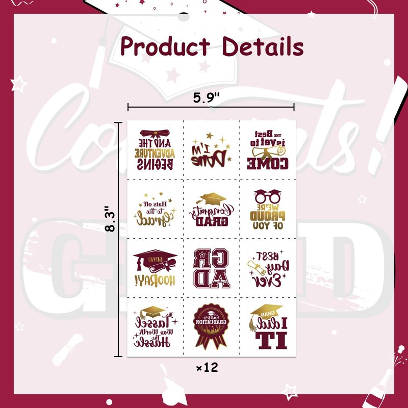Package Includes: 12 sheets of graduation temporary tattoos Style: graduation theme Color: burgundy and gold