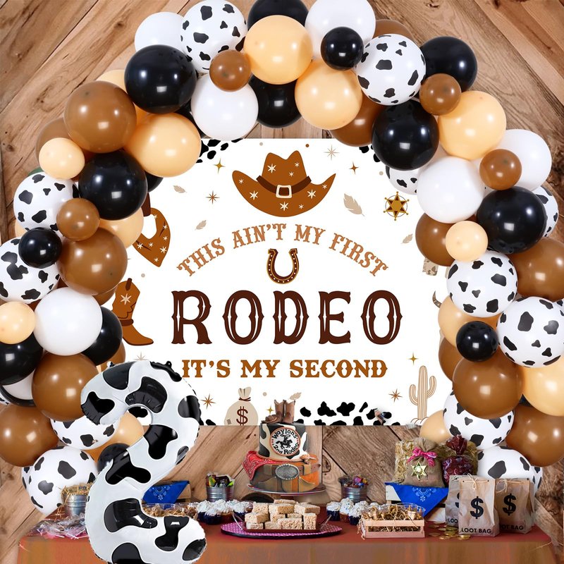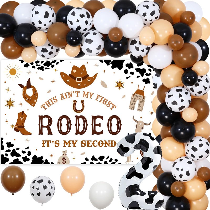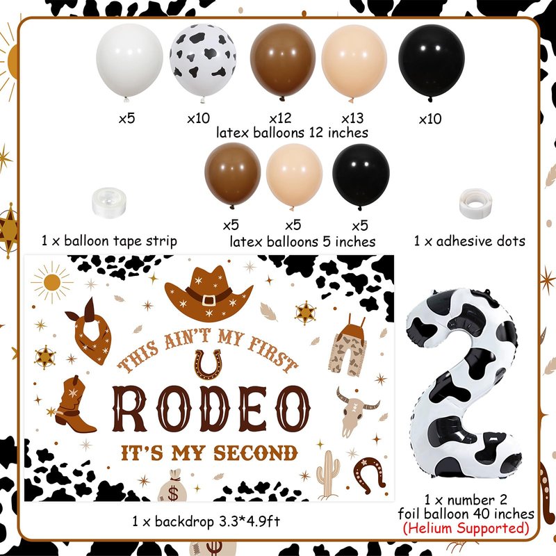 - My 2nd Rodeo Birthday Decorations: Package includes 50*12 inches latex balloons(13 retro beige, 12 retro coffee, 10 cow printed, 10 black and 5 white), 15*5 inches latex balloons(5 retro beige, 5 retro coffee and 5 black), 1 “THIS AIN'T MY FIRST RODEO ITS MY SECOND” backdrop 3.3*4.9ft, 1*32 inches number 2 foil balloon, 1 balloon tape strip, 1 adhesive dots and 2 white ribbons 33ft.