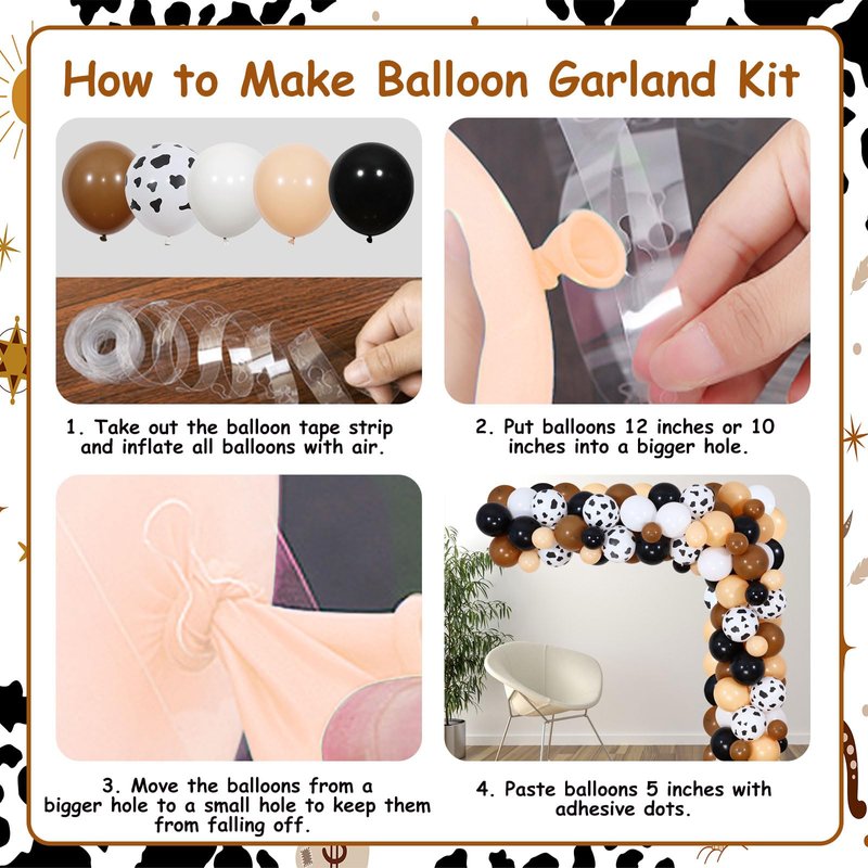 - Brown Cowboy Balloon Garland Arch Kit: Our balloon garland arch kit is enough for you to make a unforgettable party, includes retro beige, retro coffee, black, white and cow printed. As for assembling balloon garland or arch, only to insert balloons into the holes on the tape and use the balloon glues to fix the 5-inch balloons around the 12-inch balloons in different colors to fill in the gaps. It will not fall out with a set of holes.