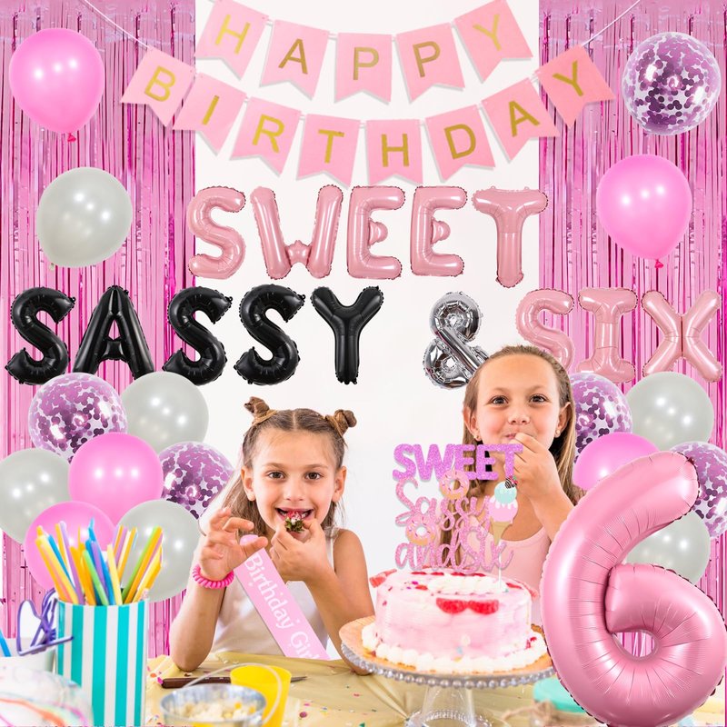 - Sweet Six Birthday Party Decorations: Package includes 15*12 inches latex balloons, 1 “HAPPY BIRTHDAY” banner, 1 “sweet sassy and six” cake topper, 1 “Birthday Girl” sash, 1*16 inches “SWEET SASSY & SIX” foil balloons, 1*32 inches number 6 foil balloon, 1 pack of fringe curtain 3.3*6.5ft and 2 white ribbons 33ft.