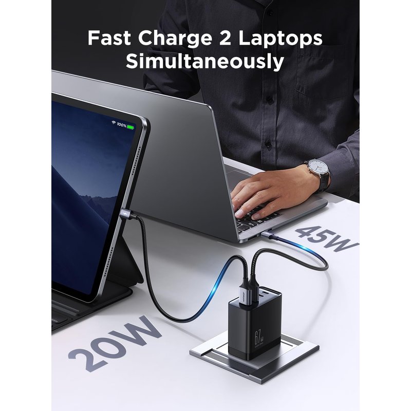 - ⚡[67W High Speed Charging] PD3.0 67W fast charging. USB C1/C2 single port output up to 67W provides 67% power to your MacBook Pro 13" in just 1 H. USB A1/A2 single port output up to 22.5W provides fast charging for 90% of Android devices. PPS certified supports super fast charging for Samsung devices, saving your dying battery in less than 1 min. (requires fast charging cable support).