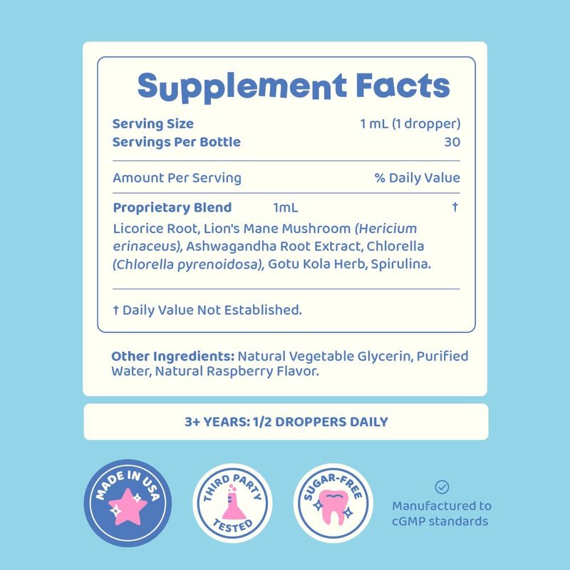 - Lion’s mane supplement for kids with brain-boosting herbs – Formulated with lion’s mane mushroom for kids, gotu kola, and ashwagandha, this blend naturally supports focus, learning, and speech development. A great alternative to mushroom gummies for kids or lion's mane powder for kids.