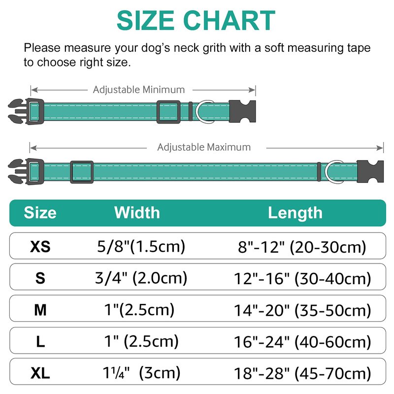 - SIZE: X-Small ⅝"W, Adjustable Length 8"-12". Small ¾"W, Adjustable Length 12"-16". Medium 1"W, Adjustable Length 14"-20" . Large 1"W, Adjustable Length 16"-24". X-Large Width 1 1/4",Adjustable Length 18-28". Suitable for puppy, small, medium and large dogs