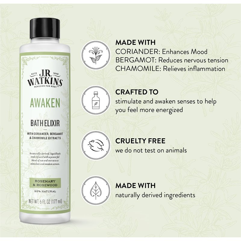 J.R. Watkins Awaken Bath Elixir, Liquid Bath Soak, Rosemary & Rosewood with Natural Extracts, No Salt, No Residue, - 6 oz - Pack of 2