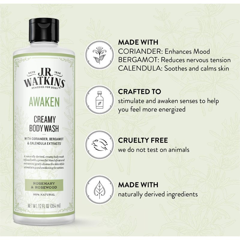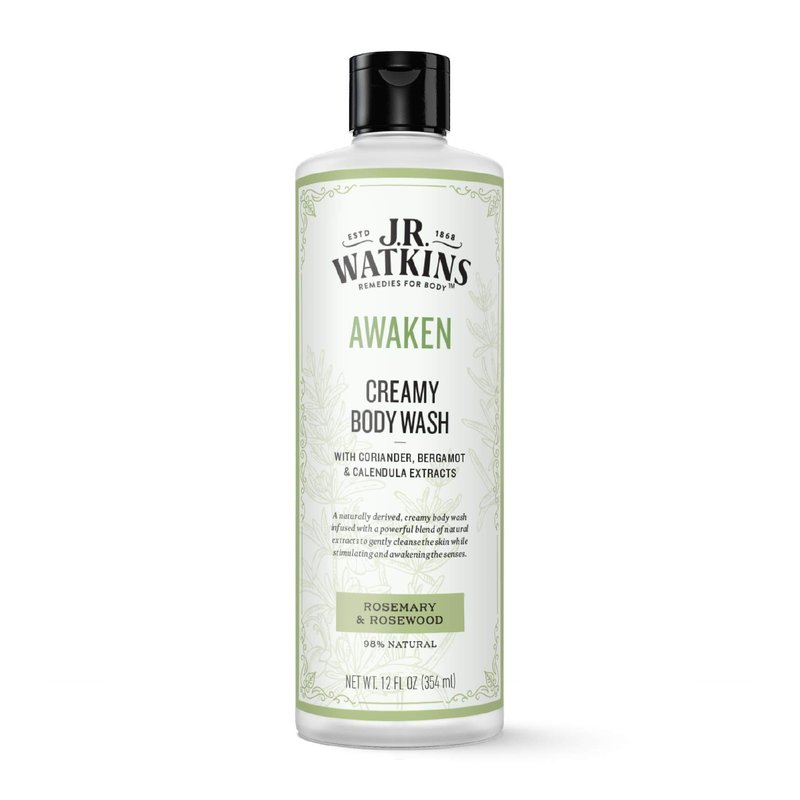 - Creamy Body Wash: J.R. Watkins AWAKEN Body Wash is crafted for sensitive skin and infused with naturally derived extracts. It cleans without stripping skin of its protective surface oils while stimulating and awakening the senses.