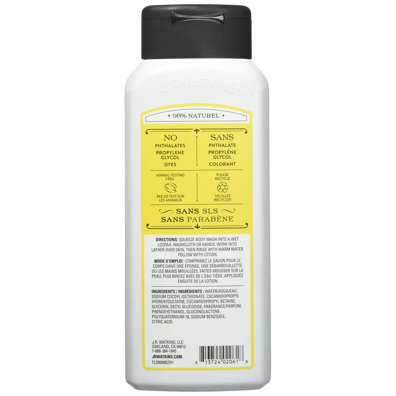 - J.R. Watkins Lemon Cream Daily Moisturizing Body Wash contains plant-based cleansers and skin conditioners to gently cleanse without stripping away natural moisture