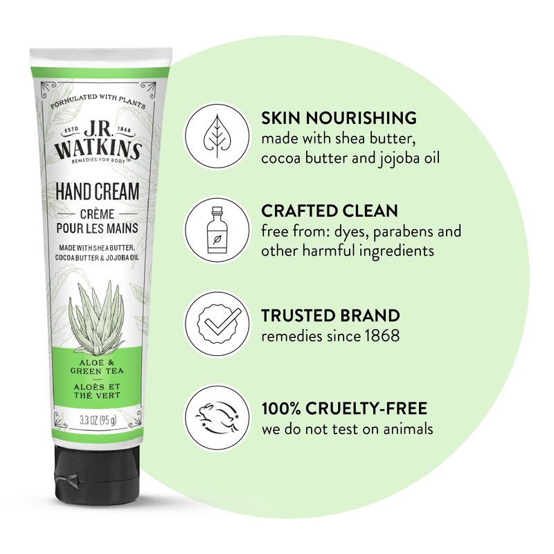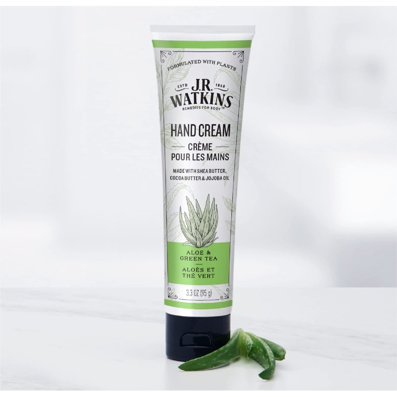J.R. Watkins Natural Moisturizing Hand Cream, Hydrating Hand Moisturizer with Shea Butter, Cocoa Butter, and Avocado Oil, USA Made and Cruelty Free, 3.3oz, Aloe & Green Tea, Single