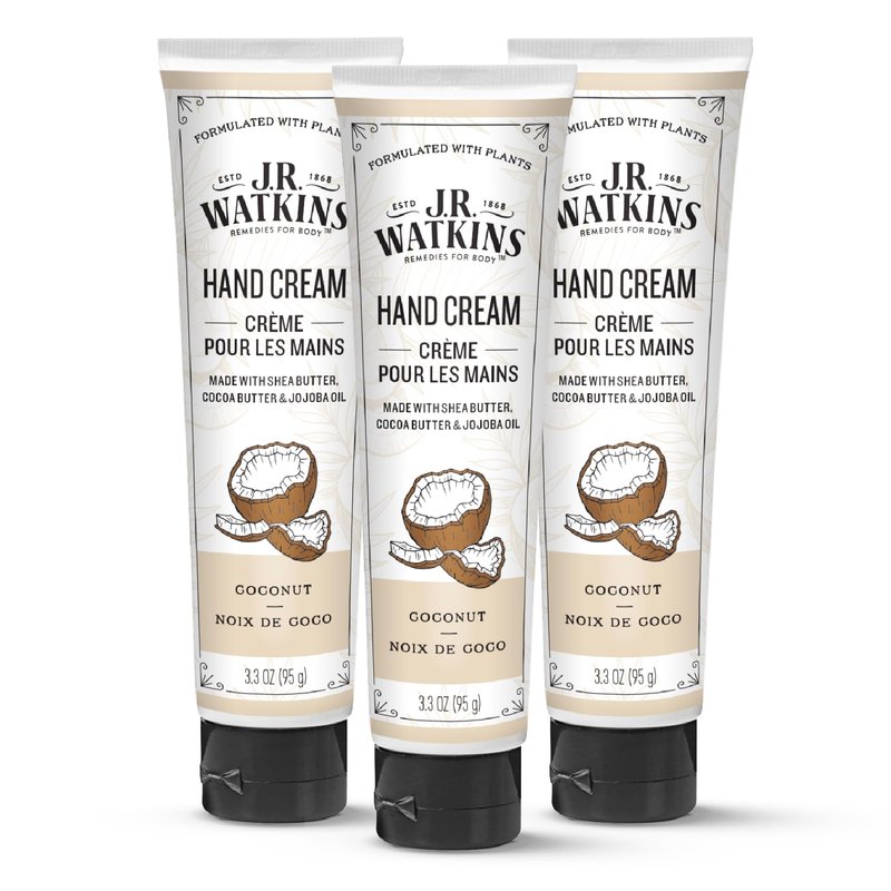 J.R. Watkins Natural Moisturizing Hand Cream, Hydrating Hand Moisturizer with Shea Butter, Cocoa Butter, and Avocado Oil, USA Made and Cruelty Free, 3.3oz, Coconut, 3 Pack