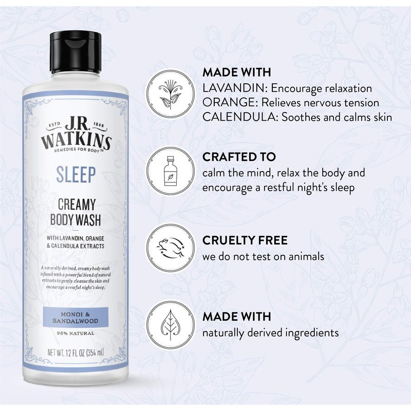 - Creamy Body Wash: J.R. Watkins SLEEP Body Wash is crafted for sensitive skin and infused with naturally derived extracts. It cleans without stripping the skin of its protective surface oils while calming the mind, relaxing the body and encouraging a restful night's sleep.