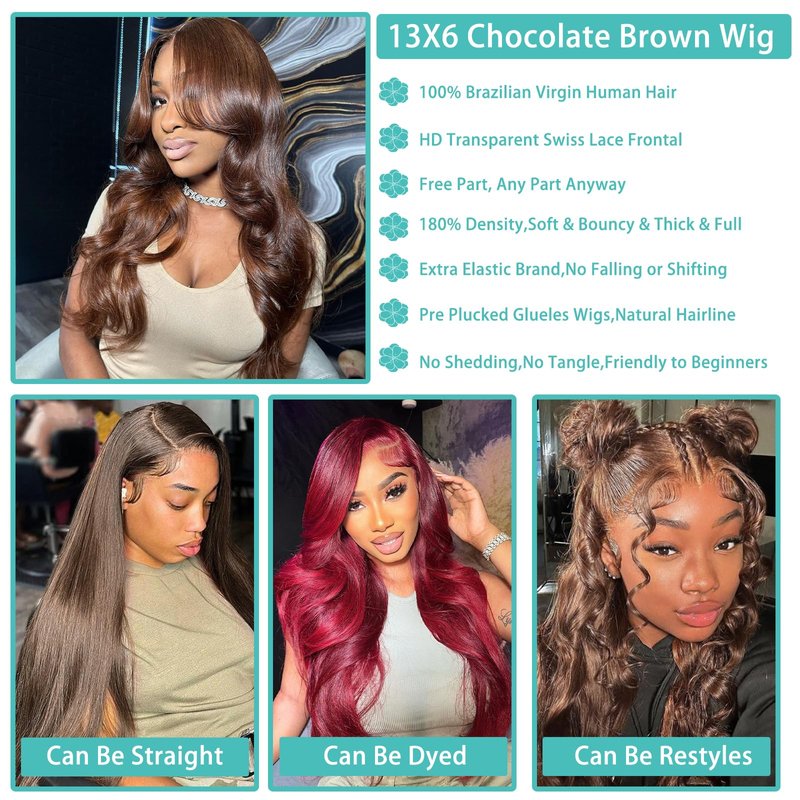 - 【13x6 Chocolate Brown Human Hair Wigs Advantage】:Brown lace front wig human hair,chocolate brown hair is a hair styling color trend that looks to stay around for a while. in line with your pursuit of a new trend and new fashion.glueless transparent lace wig real hair, can be restyled as you like, ,permed ,straighted and dyed to any color you want.give you variable color and fashion styles and beauty.