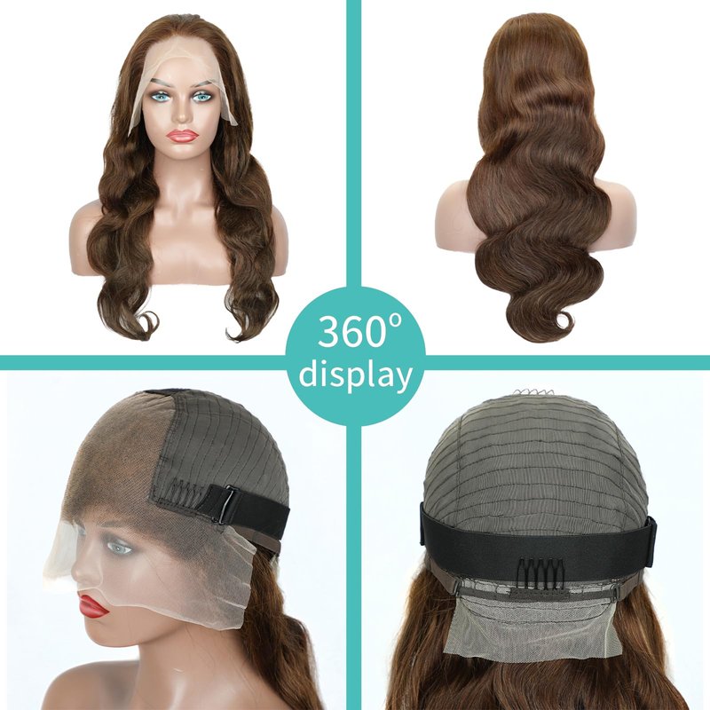 - 【Brown Body Wave Human Hair Wigs Quality】:13x6 Brown body wave lace front wigs human hair,180% density glueless wigs human hair pre plucked with natural hairline ,realistic looking ,true to length, 22-32 inches available,fuller and thicker.upgrade swiss lace suitable for all skin colors,breathable and durable ,lace material make it more comfortable.lightly bleached knots with baby hair around to give you a natural looking.
