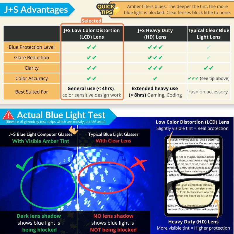 - [Low Color Distortion] enjoy vibrant clarity without compromising color accuracy. Our LCD lens has ~52% overall blue light blocking rate as well as 100% UVA and UVB protection. Perfect for general daily usage for <4hrs, and is especially great for color sensitive work (e.g. photoshop, graphics design or watching movies). LCD lens have a light yellow tint.