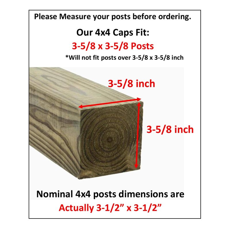 Please take time to measure your post not all 4x4 post are the same dimension. These caps are for Nominal 4X4 fence posts that measure 3-5/8"x 3-5/8"
