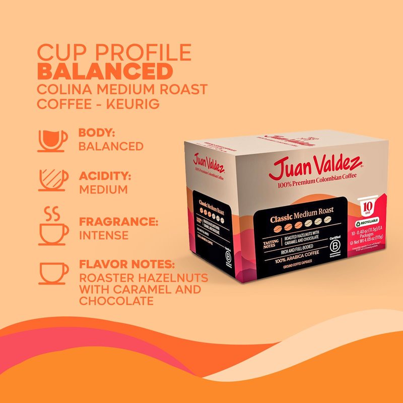 Juan Valdez Coffee Pods – Classic Medium Roast | K-Cups for Keurig Coffee Machines | 100% Colombian Arabica Beans | White Chocolate & Peach Notes | Single Serve Coffee Pods | 10 Count
