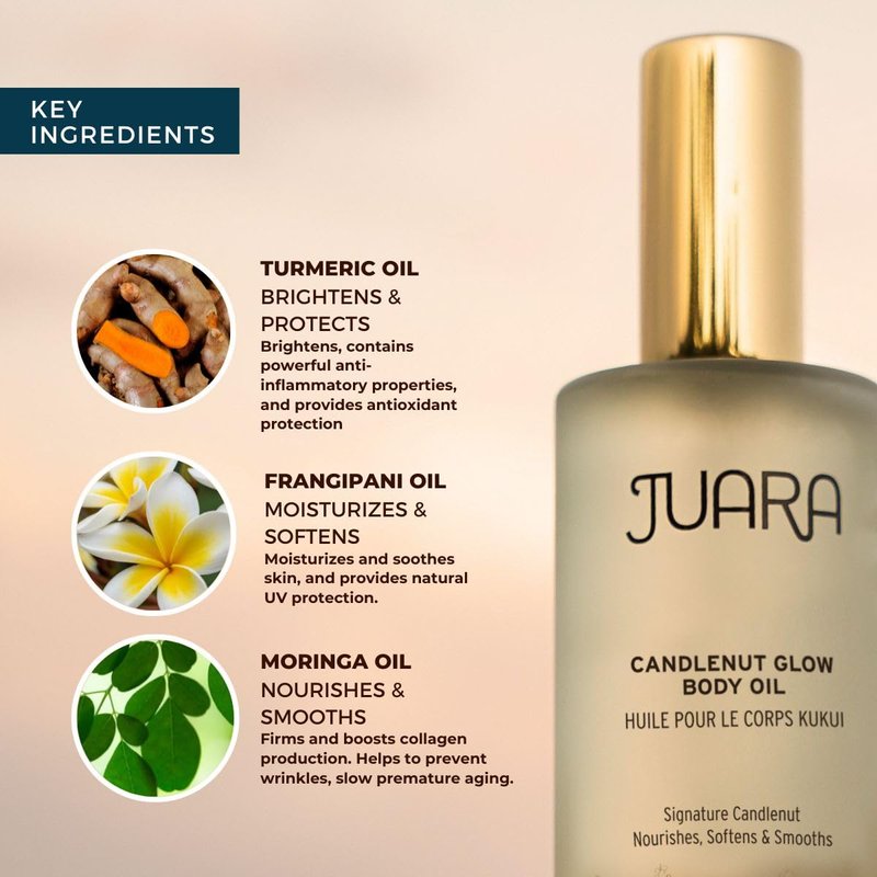 JUARA’s Candlenut Glow Body Oil will boost the rejuvenation, replenishment, and firming of your skin. Massage this ultra-luxurious dry oil into your hair and down to your toes for a full body pampering. Indulge your senses with the captivating fragrance, glistening look, and moisturized softness of your skin.