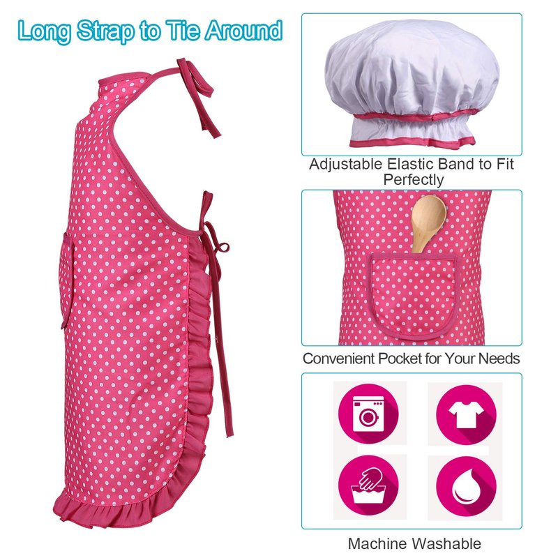 - ✅ KIDS CHEF HAT AND APRON SET - Chef Apron is pink with white polka dots and frilly edges, comes with a 12" strap to tie around neck and waist to fit even the toddler girl. Chef’s Hat is white with pink trim and has an adjustable elastic band to perfectly fit a child's head.